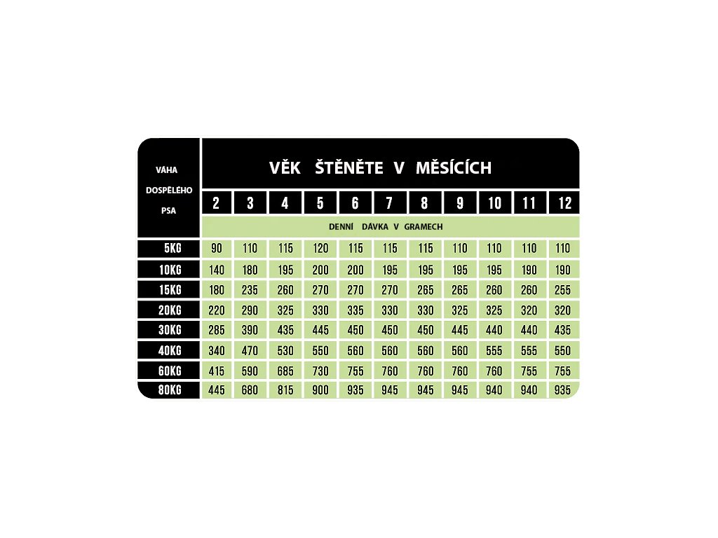 Aminokyseliny v krmivu pro štěňata: lysin* 1,5 %, methionin* 0,6 %, cystin* 0,25 %, threonin* 0,8 %, tryptofan* 0,25 %, isoleucin* 0,6 %, leucin* 1,15 %, fenylalanin* 0,65 %, tyrosin* 1,05 %, valin* 0,70 %, arginin* 0,90 %, histidin* 0,35 %.